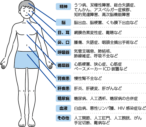 20~64 歳までの方が対象で、交通事故で障害になった人や生まれつき知的障害(精神遅滞)があるような人ばかりでなく、あらゆる病気やケガを負われた方が障害年金の対象となります。下記の障害年金の対象となる症例の一部をご覧ください。